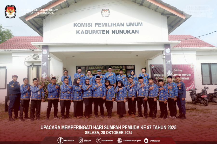 KPU Kabupaten Nunukan Melaksanakan Upcara Memperingati Hari Sumpah Pemuda ke 97 Tahun 2025 dengan Tema "Pemuda Pemudi Bergerak,Indonesia Bersatu" yang dilaksanakan di halaman Kantor KPU Nunukan pada hari Selasa Tanggal 28 Oktober 2025 yang di hadiri oleh Sekretaris KPU nunukan selaku Pemimpin Upacara , Kasubbag Hukum, Kasubbag Teknis, Kasubbag KUL dan Kasubbag Perencanaa, Data dan Informasi berserta Pegawai Staff Sekretariat KPU nunukan ....