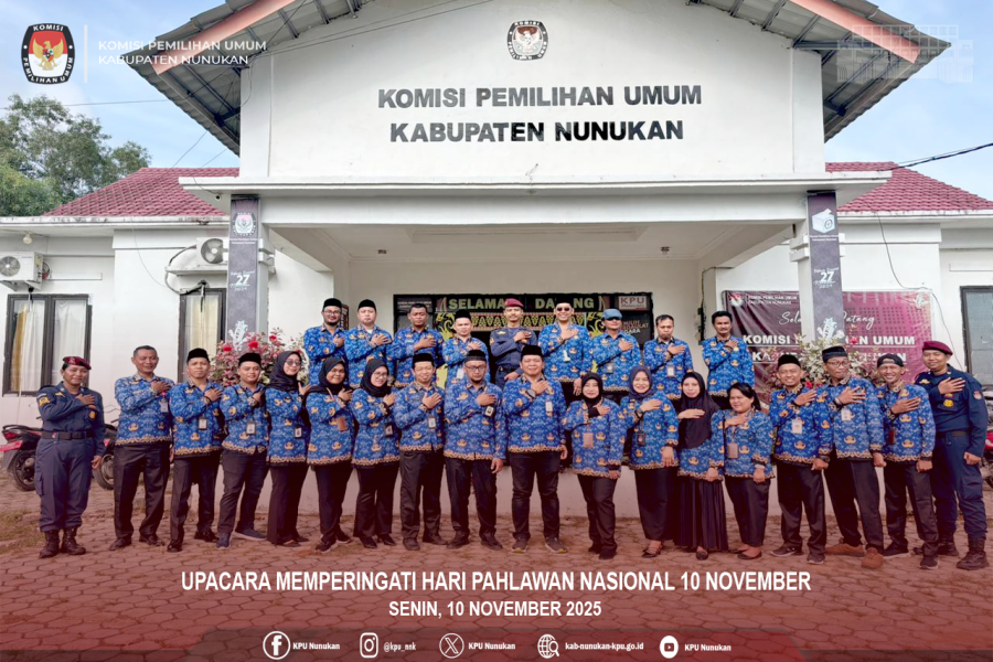 KPU Kabupaten Nunukan Melaksanakan Upcara Memperingati Hari Pahlawan Nasional dengan Tema "Pahlawanku Teladanku, Terus Bergerak Melanjutkan Perjuangan" yang dilaksanakan di halaman Kantor KPU Nunukan pada hari Senin Tanggal 10 November 2025 yang di hadiri oleh Sekretaris KPU nunukan selaku Pemimpin Upacara , Kasubbag Hukum, Kasubbag Teknis, Kasubbag KUL dan Kasubbag Perencanaa, Data dan Informasi berserta Pegawai Staff Sekretariat KPU nunukan ....