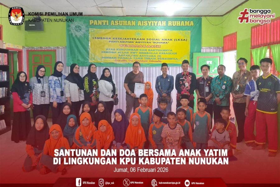KPU Kabupaten Nunukan melaksanakan kegiatan Santunan dan Doa bersama Anak Yatim di Lingkungan KPU dalam rangka bentuk kepedulian Komisi Pemilihan Umum terhadap generasi bangsa dan mempererat tali silaturahmi serta meningkatkan solidaritas antar sesama, Jum'at (5/2/2026). KPU Peduli Anak Yatim untuk Menyambut Bulan Suci Ramadhan di Lingkungan KPU. ....