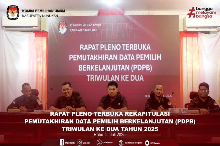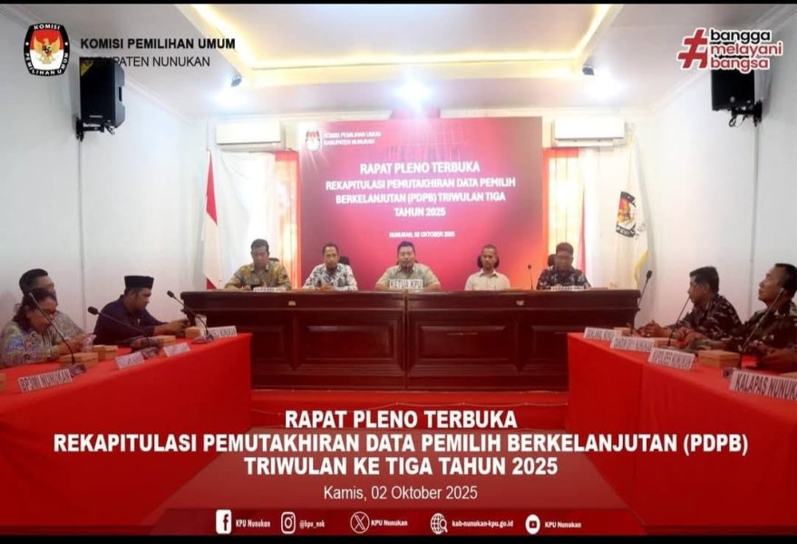 Komisi Pemilihan Umum Kabupaten Nunukan Melaksanakan "Rapat Pleno Terbuka Rekapitulasi Pemutakhiran Data Pemilih Berkelanjutan (PDPB) Triwulan III Tahun 2025 yang dilaksanakan Pada hari Kamis tanggal 2 bulan Oktober 2025 di aula Kantor KPU nunukan Jam 10.00 Wita s/d yang di hadiri oleh Lima Komisioner KPU nunukan, Sekretaris KPU Nunukan, Ketua Bawaslu Nunukan dan Bawaslu Prov. Kaltara, Kodim, Lanal Nunukan,Kapolres Nunukan, Kesbangpol, BP3MI, Lapas Nunukan,Camat Nunukan dan Nunukan selatan dan Sekretariat KPU nunukan