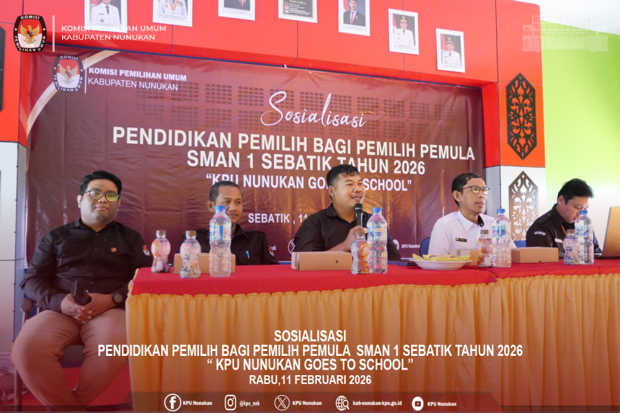 KPU Kabupaten Nunukan Melaksanakan "Sosialisasi Pendidikan Bagi Pemilih Pemula di SMAN 1 Sebatik" yang dilaksanakan Pada hari Rabu Tanggal 11 Februari 2026 bertempat di Aula SMAN 1 Sebatik yang di hadiri oleh Ketua KPU selaku Pembuka Acara Kegiatan Nunukan dan Anggota KPU Divisi Teknis Pembawa Materi Kegiatan dan Divisi Hukum beserta dari Sekretariat KPU Kabupaten Nunukan serta di hadiri oleh Perwakilan Kepala Sekolah Beserta Guru SMAN 1 sebatik adapun Pesertanya dari Perwakilan adalah Murid SMAN 1 Sebatik .