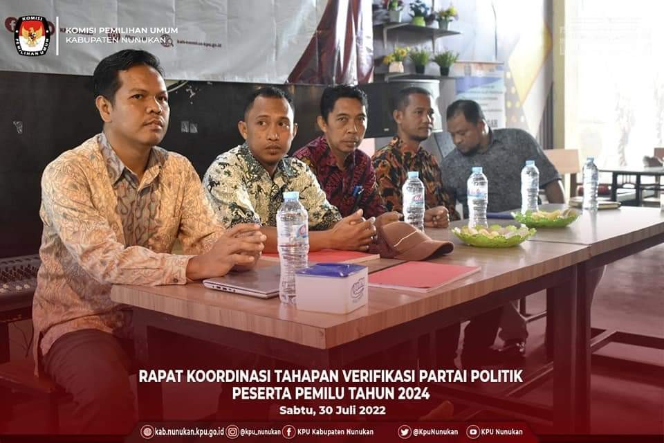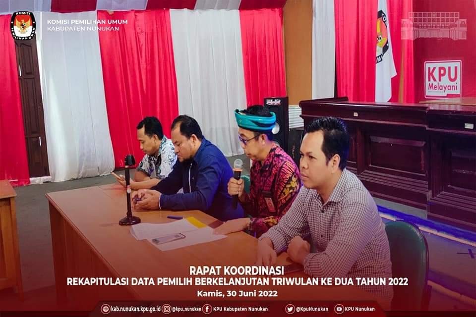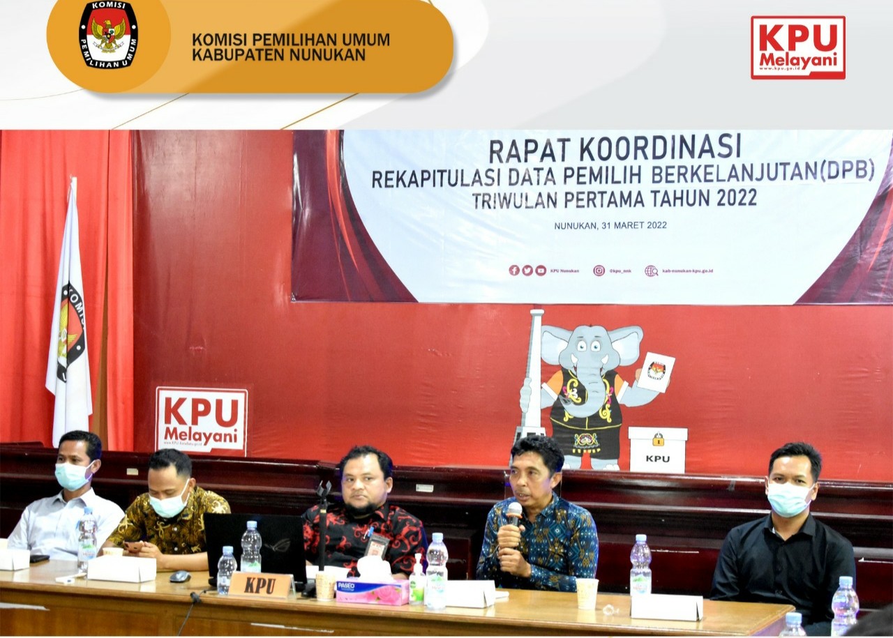 Kamis, 30 juni 2022. KPU Kabupaten Nunukan melaksanakan Rapat Koordinasi Rekapitulasi Data Pemilih Berkelanjutan (DPB) Triwulan kedua Tahun 2022. Rakor DPB Berkelanjutan ini dihadiri oleh seluruh stakeholder dari KPU Kabupaten Nunukan, Bawaslu Kabupaten Nunukan, Disdukcapil Nunukan, Kesbangpol Nunukan, Polres Nunukan, Kodim 0911/NNK, Kemenag Nunukan dan Perwakilan pengurus Partai-partai Politik. Rakor ini dibuka oleh Ketua KPU Kabupaten Nunukan Rahman. SP dilanjutkan dengan penyampain pimpinan KPU Kabupaten Nunukan Divisi Perencanan, Data dan Informasi Mardi Gunawan, S. I.Kom terkait Data Pemilih Berkelanjutan Kabupaten Nunukan serta Sosialisasi Aplikasi Lindungi HakMu, dan Sosialisasi sebelas Tahapan Pemilu 2024 Oleh Kaharuddin Komisioner divisi Teknis, diakhiri dengan Diskusi tanya jawab oleh peserta Rakor. Sebelas Tahapan Pemilu 2024 yakni: 1. Penyusunan Peraturran KPU (14 Juni 2022 -14 Desember 2023) 2. Pemutakhiran Data Pemilih dan Penyusunan Daftar Pemilih (14 Oct 2022 - 21 Juni 2023) 3. Pendaftaran dan Verifikasi Peserta Pemilu (29 Juli 2022 - 13 Desember 2022) 4. Penetapan Peserta Pemilu (14 Desember 2022) 5. Penetapan Jumlah Kursi dan Penetapan Dapil (14 Oct 2022 - 9 Februari 2023) 6. Pencalonan (6 Desember 2022 DPD, Legislatif 24 April, Presiden/Wapres 19 Oct, - 25 November 2023) 7. Masa Kampaye Pemilu (28 November 2023 - 10 Februari 2024) 8. Masa Tenang (11 - 13 Februari 2024) 9. Pemungutan dan Penghitungan Suara (14 Februari 2024) 10. Penetapan Hasil Pemilu (Paling lambat 3 hari pasca Putusan/tidak ada PHP dari Mahkamah Konstitusi) 11. Pengucapan Sumpah/Janji (DPR dan DPD 1 Oct 2024, Presiden/Wapres 20 Oct 2024, DPRD diseesuaikan akhir masa Jabatan). Perlu diketahui dalam Rekapitulasi Daftar Pemilh Berkelanjutan KPU Kabupaten Nunukan bulan Juni 2022 menetapkan DPB sebanyak 117.308 pemilih.