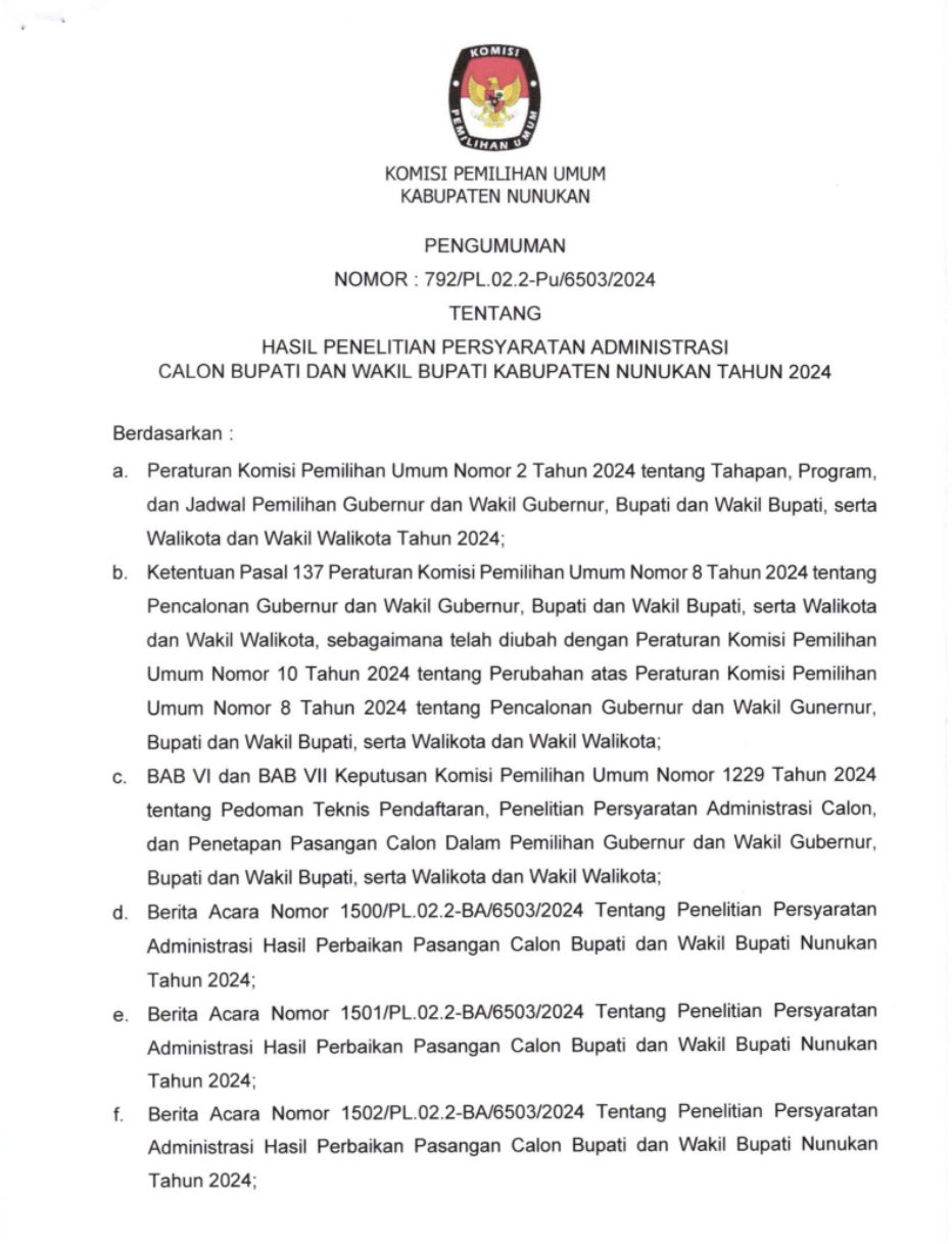 Berikut Pengumuman Hasil Penelitian Persyaratan Administrasi Calon Bupati dan Wakil Bupati Kabupaten Nunukan 2024.