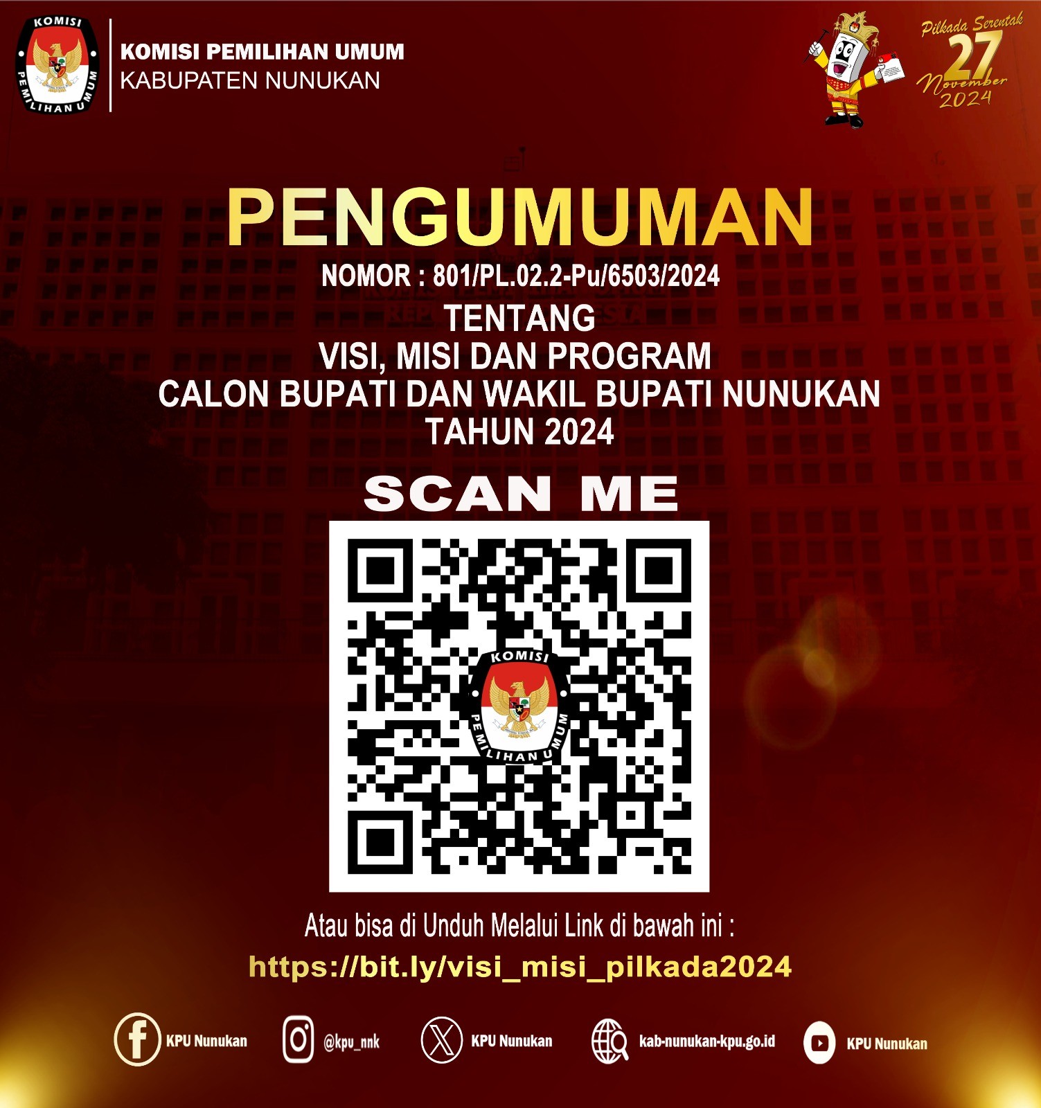 Pengumuman Nomor 801/PL.02.2-Pu/6503/2024 Tentang Visi Misi dan Program Calon Bupati dan Wakil Bupati Nunukan Tahun 2024