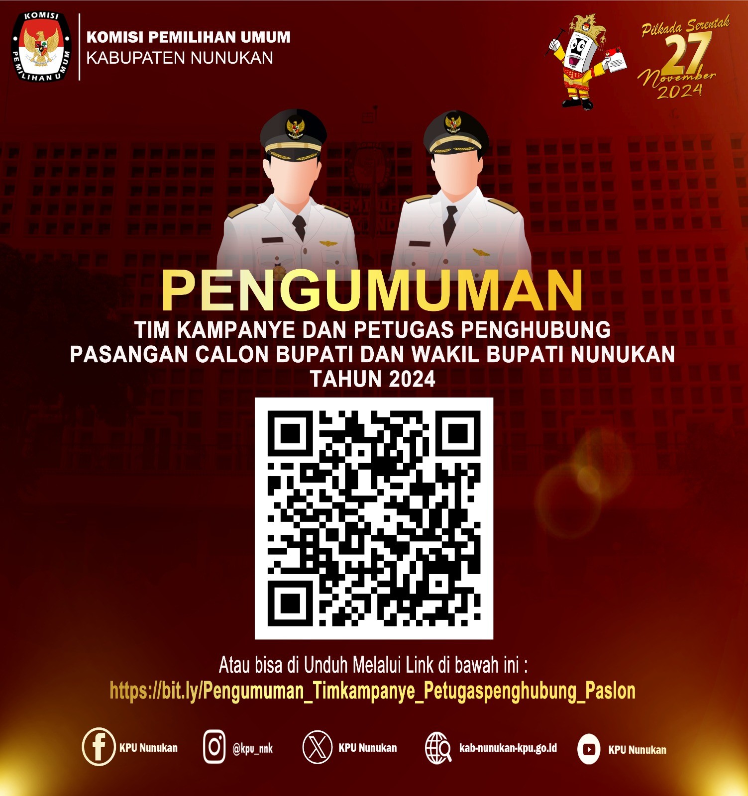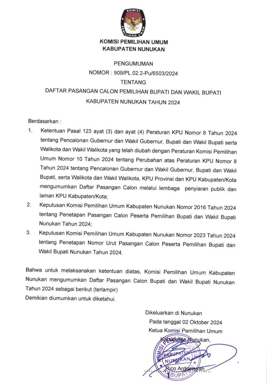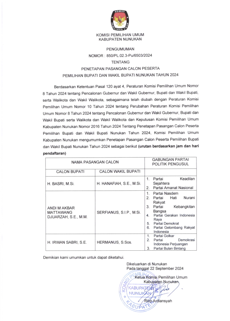 PENGUMUMAN NOMOR : 850/PL.02.3-Pu/6503/2024 TENTANG PENETAPAN PASANGAN CALON PESERTA PEMILIHAN BUPATI DAN WAKIL BUPATI NUNUKAN TAHUN 2024.