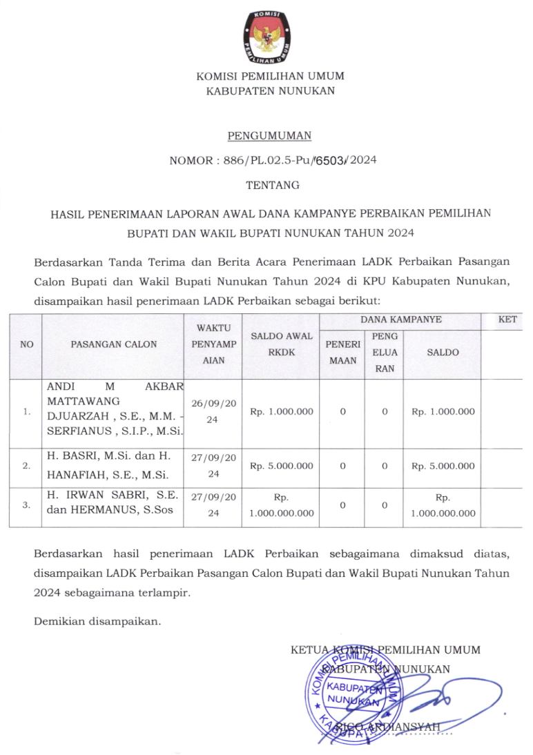 Pengumuman Nomor 886/PL.02.5-Pu/6503/2024 Tentang Hasil Penerimaan Laporan Awal Dana Kampanye Perbaikan Pemilihan Bupati dan Wakil Bupati Nunukan Tahun 2024