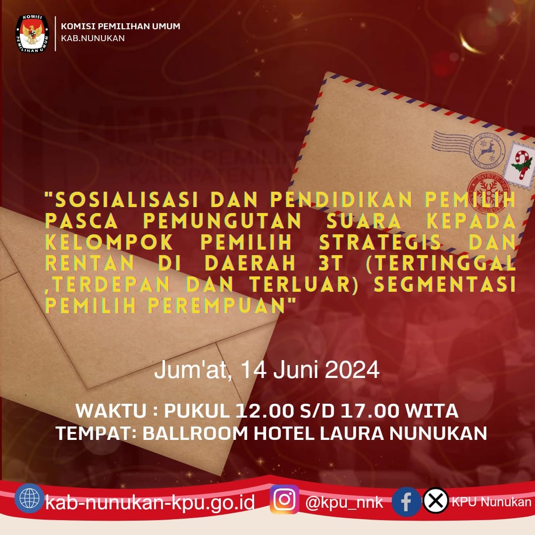 KPU Republik Indonesia melaksanakan Sosialisasi dan Pendidikan Pemilih Pasca Pemungutan Suara kepada Kelompok Pemilih Strategis dan Rentan di Daerah 3T (Tertinggal, Terdepan, dan Terluar) Pada Pemilihan Umum Tahun 2024, dengan segmentasi pemilih perempuan, Jumat 14 Juni 2024 bertempat di Ballroom Laura Hotel Nunukan.