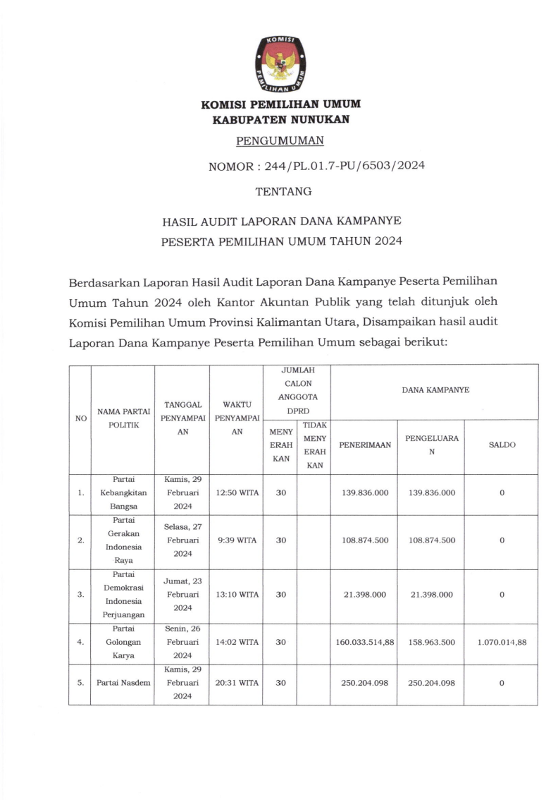 Pengumuman Nomor 244/PL.01.7-PU/6503/2024 Tentang Hasil Audit Laporan Dana Kampanye Peserta Pemilihan Umum Tahun 2024