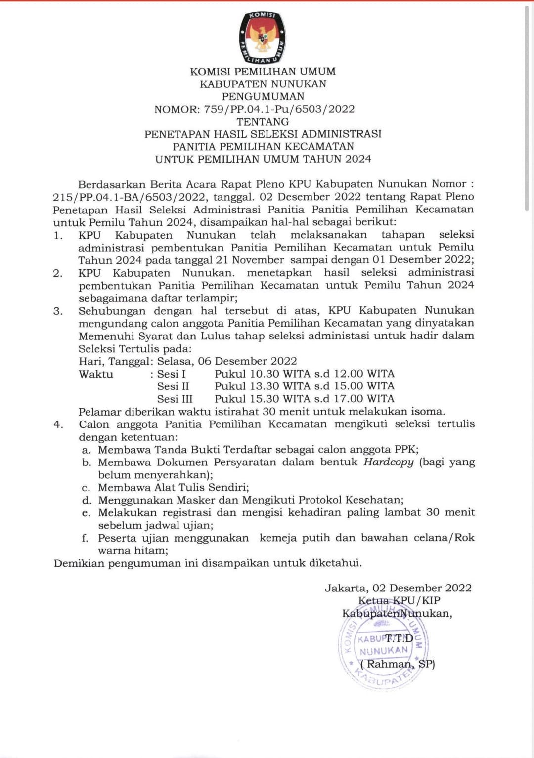 #TemanPemilih, KPU Nunukan sampaikan Pengumuman Nomor: 57/PP.04.1-Pu/6503/2022 Tentang Hasil Penelitian Administrasi Calon Anggota Panitia Pemungutan Suara (PPS) Untuk Pemilihan Umum Tahun 2024.